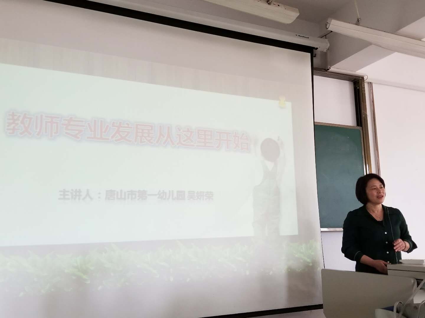 2019年5月21日下午3:00,特教楼503教室,yL23411永利集团邀请唐山第一幼儿园吴妍荣园长为学前教育专业的同学生们举办题为《教师专业发展从这里开始》的学术讲座。讲座由学前教育教研室主任岳瑞娟老师主持,约240名学生参加了此次学术讲座。