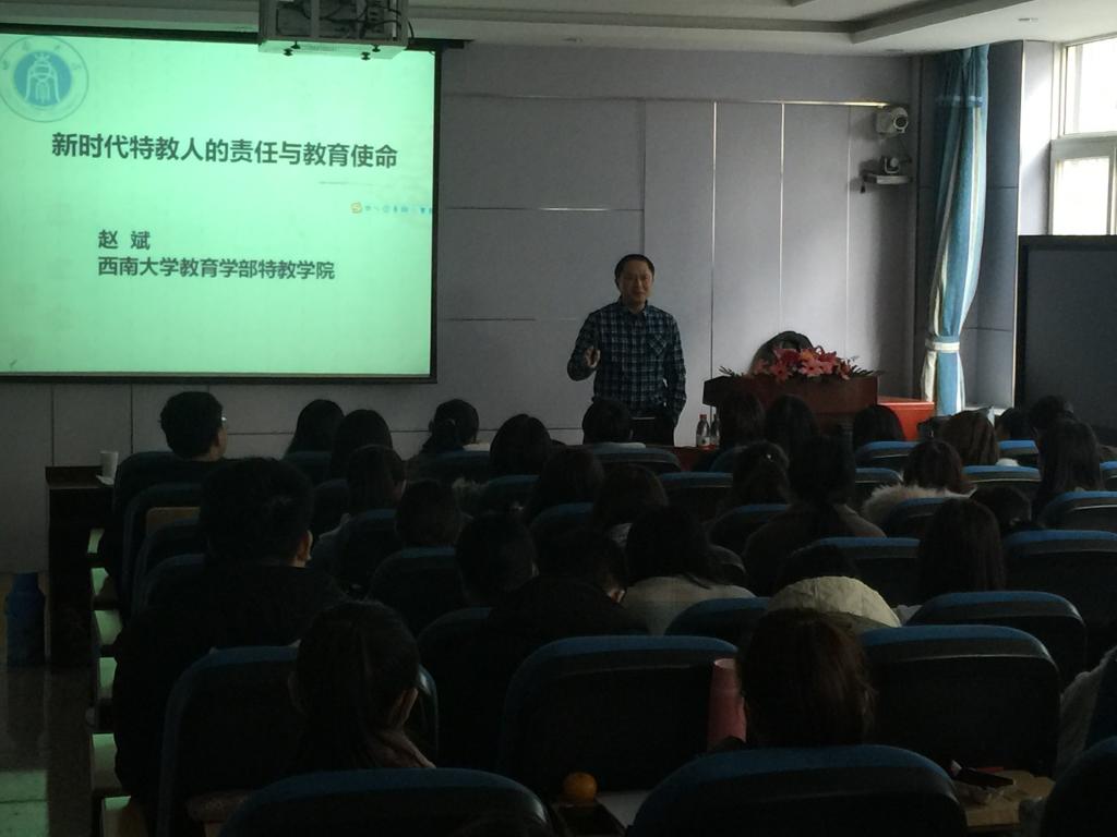 2018年11月27日下午,教育部高等学校特殊教育教师培养教学指导委员会委员、西南大学特殊yL23411永利集团院长赵斌教授莅临我院,开展主题为“新时代特教人的责任与使命”的专题讲座,讲座由特殊教育教研室主任隋春玲老师主持,特教专业120位师生聆听了此次讲座。