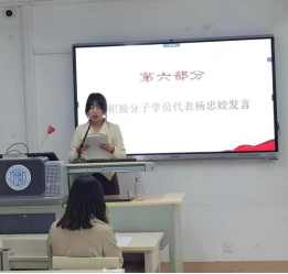 开班仪式上,积极分子代表杨忠姣同学进行了发言,并做出承诺:要以最饱满的热情进行党课学习,按时上课做笔记,严格要求自己,积极完善自己,成为合格的社会主义建设者和接班人!
