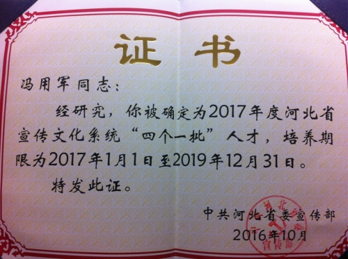 2016年11月25日,中共河北省委宣传部第24期《宣传工作通报》印发《中共河北省委宣传部关于确定2017年度河北省宣传文化系统“四个一批”人才人选的通报》,根据省委组织部、省委宣传部、省人事厅《河北省宣传文化系统“四个一批”人才培养工作办法》(冀宣发〔2003〕16号)精神和省委组织部、省委宣传部《关于印发< 河北省宣传思想文化人才队伍建设中长期规划(2012-2020年)>的通知》(冀组[2013]15号)要求,经组织推荐、资格审查、专家评审和领导小组审定,共有100名同志入选2017年度河北省宣传文化系统“四个一批”人才人选,我院冯用军博士入选。这是冯用军博士继2016年10月1日入选河北省“三三三人才工程”二层次人选之后取得的又一项荣誉。冯用军博士的入选,是我院重视人才培养特别是青年教师培养的重要成果。