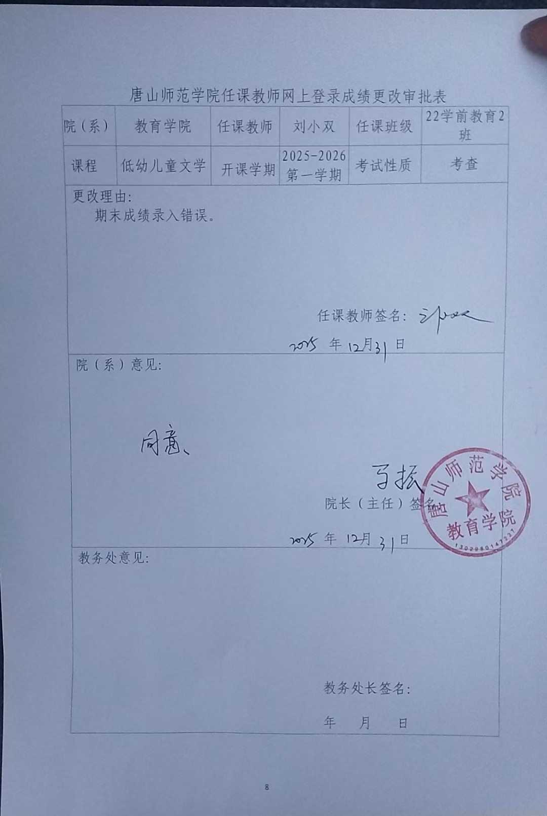 永利集团任课教师网上登录成绩更改审批表