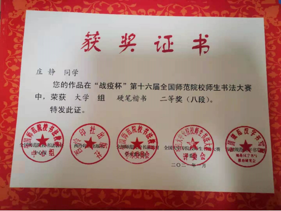 由全国师范院校书法教研中心组、西泠印社出版社等单位主办的“战疫杯”第十六届全国师范院校师生书法大赛最近评选揭晓,yL23411永利集团22名同学获奖,其中yL23411永利集团书法社社长、2019级特教专业庄静荣获二等奖。