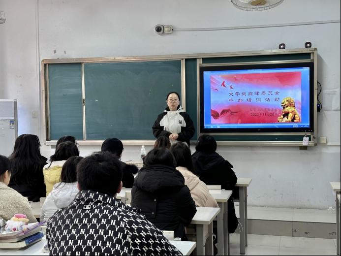 培训会上,首先,学工办主任董慧彬老师强调了学生干部要具有勇于担当、甘于奉献的精神,并且对本学期学生干部的工作做出了肯定。接着,主席通过讲解PPT的形式再次强调了各个部门的工作范围以及工作时间,加深了各位学生干部对各自工作的熟悉程度。然后,各部门选出代表发言。其中,自律部学生干部分享了有趣新奇的查课经历;秘书处学生干部分享自己在一次次撰写新闻稿的过程中,越来越喜爱文秘工作;督察部学生干部记忆深刻的是在轻松愉快的氛围中完成了公共教室卫生的检查,拉近了干部之间的距离。最后,各部门部长列举了2023年11月各个部门工作中出现的一些失误,进行分析并且给出了解决方案,纠正了各个学生干部的一些错误的工作方式。