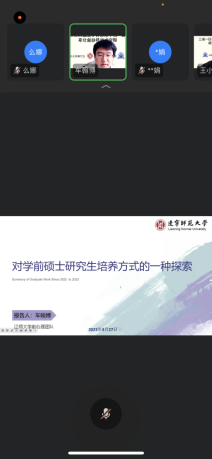 2023年4月27日上午,yL23411永利集团学前教育专业参加协同提质院校沈阳师范大学主持的教育部三省一区学前教育虚拟教研室活动。本次活动主题为研究生指导经验分享,是学前教育虚拟教研室系列教研活动的开端。会议采用钉钉线上会议形式,包含我院学前教育专业教师团队在内的四所高校教师参加。