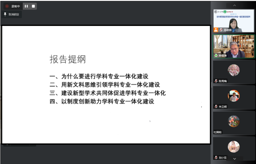 科研处处长袁森林在学术活动开始简要介绍了我校参与协同提质工作的情况,提出学科建设和学位建设的重要性。朴雪涛院长在主题讲座中结合相关工作经验,对为什么进行学科和专业一体化建设进行分析,提出其原因是由学科和专业存在的内在逻辑关系、地方师范院校的发展定位而决定。朴院长提出,要用新文科思维引领学科专业一体化建设,贯彻新文科理念,坚持中国问题、中国数据、中国话语、中国理论,坚持需求导向、价值引领,打破学科壁垒。同时,在具体工作中,要建设新型学术共同体,以制度创新助力学科和专业一体化建设。在交流环节,朴雪涛院长结合参会教师提出的问题,对教改和科研的关系进行了分析,强调了基层学术组织的重要性,并基于沈阳师范大学的学科和专业建设经验,提出多学科理论、多学科视野、多学科方法、多学科团队的重要性。