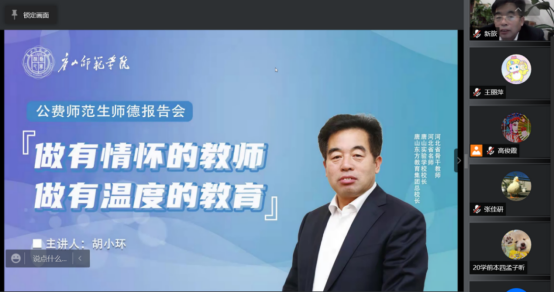 2022年3月31日晚7:00,yL23411永利集团在线上举办全校公费师范生师德讲堂,特邀东方教育集团总校长、唐山实验学校校长、永利集团中文系兼职教授胡小环为全校公费师范生做题为《做有情怀的教师 做有温度的教育》的专题讲座。yL23411永利集团院长张学鹏教授、副院长高俊霞教授及全校270余名公费师范生参加了本次讲座。