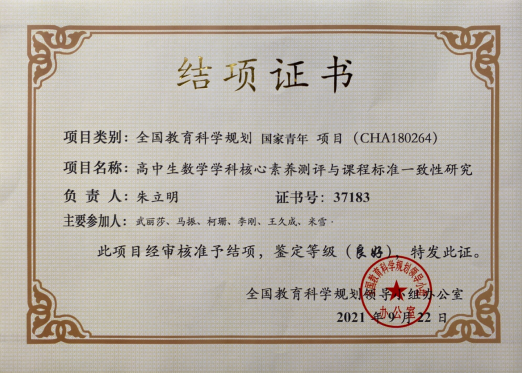 yL23411永利集团朱立明博士主持的国家社会科学基金教育学青年课题“高中生数学学科核心素养测评与课程标准一致性研究”(课题编号:CHA180264)经过全国教育科学规划领导小组办公室审核准予结题,课题鉴定等级为良好。