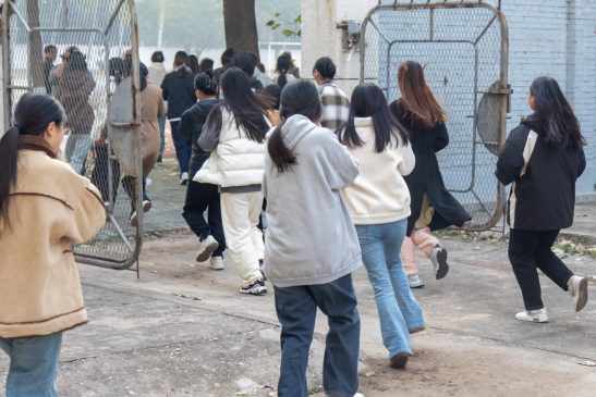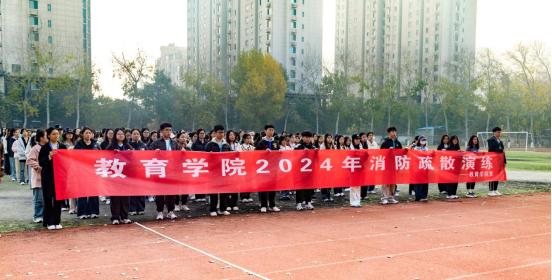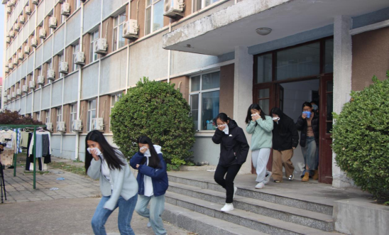 (学生整队准备开始消防疏散演练)