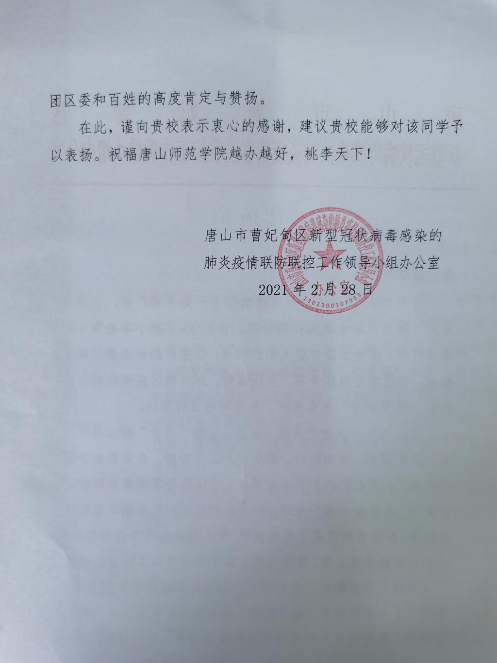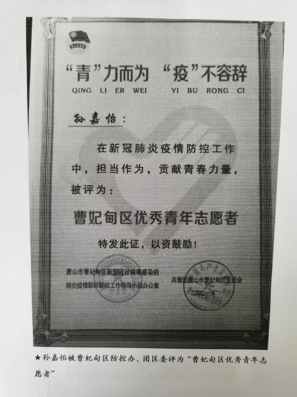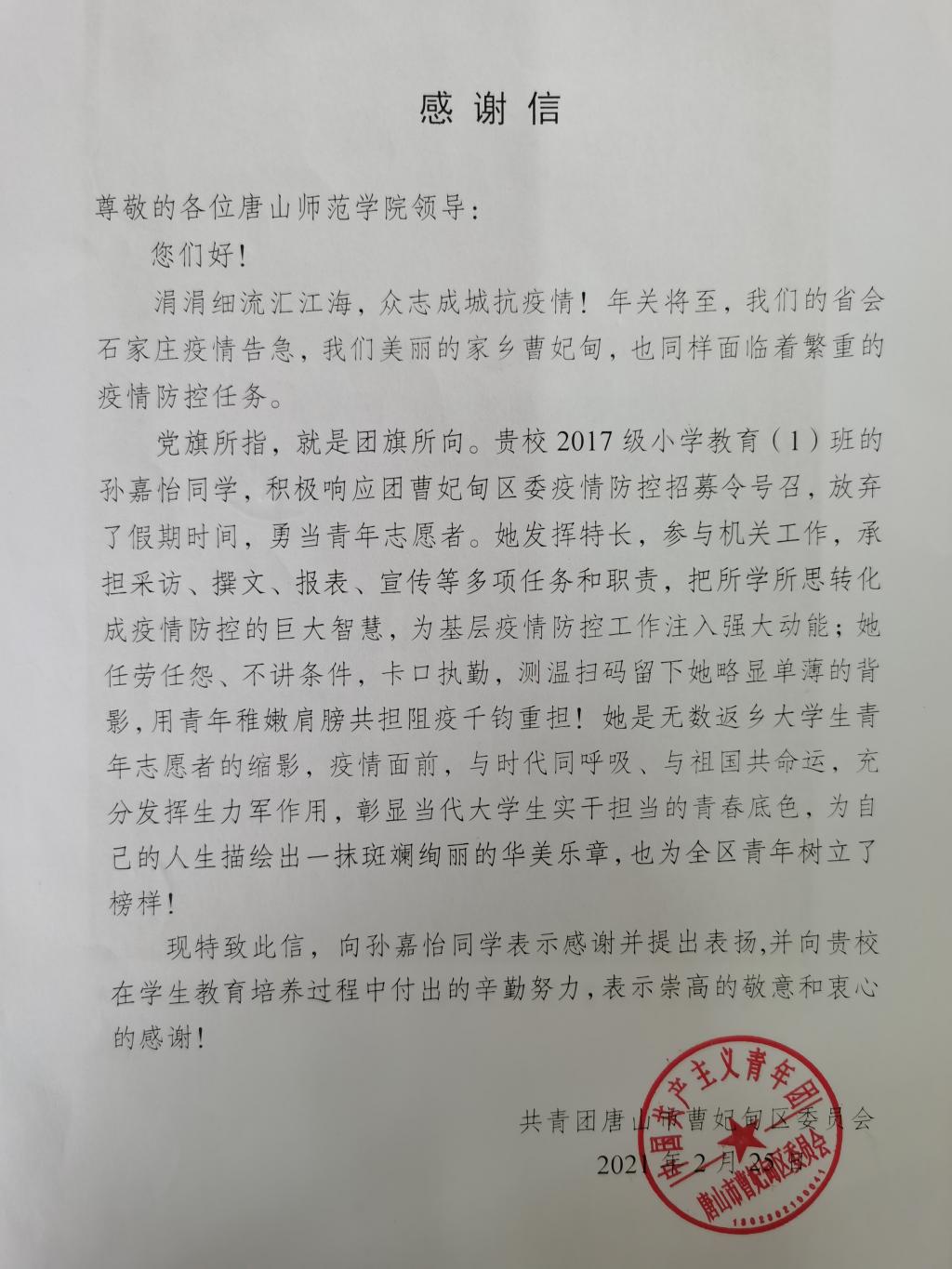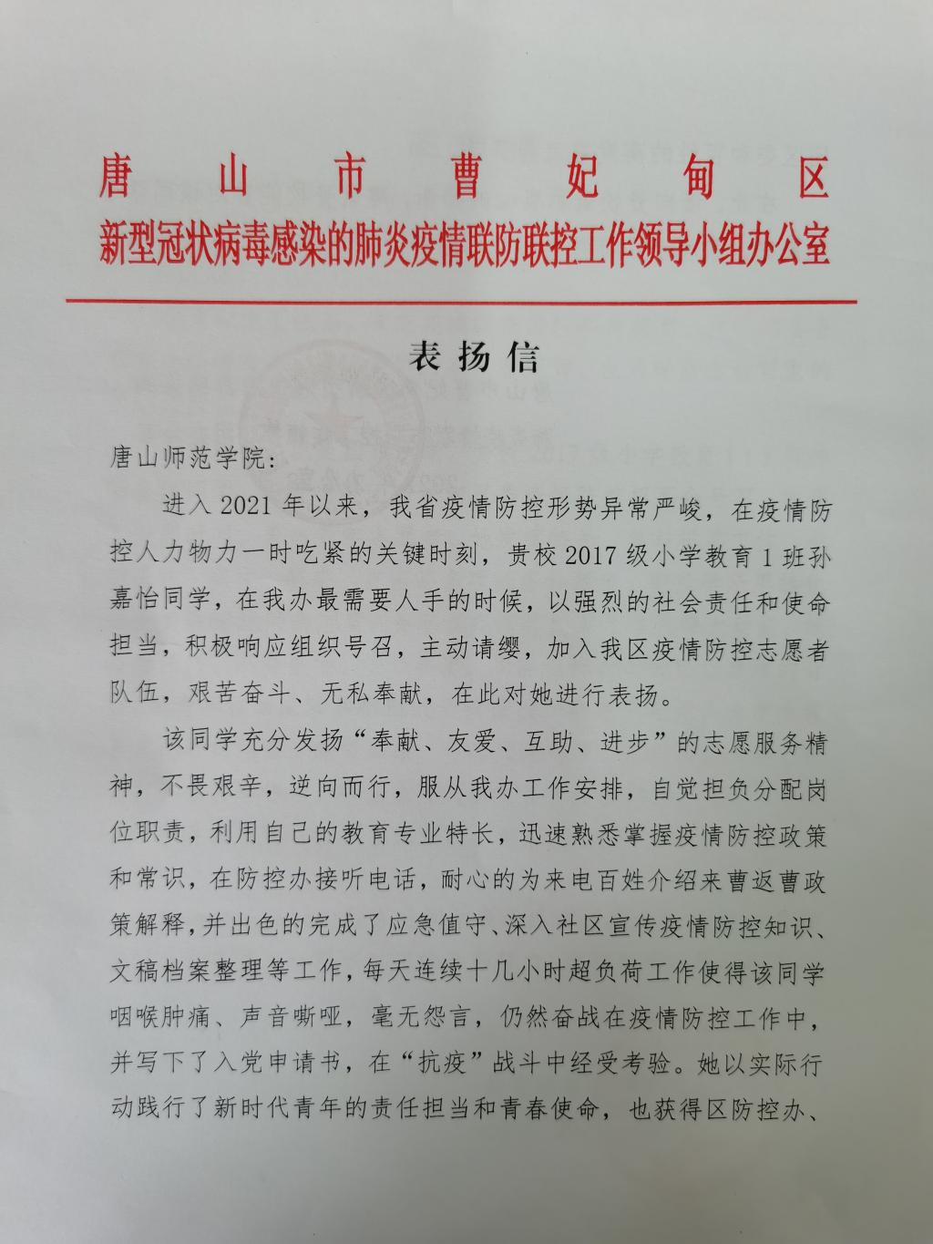 我院2017级小学教育本科1班学生孙嘉怡,积极响应团曹妃甸区委疫情防控招募令的号召,她发挥特长,参与机关工作,承担采访、撰文、报表、宣传等多项任务和职责,得到了唐山市曹妃甸区新型冠状病毒感染的肺炎疫情联防联控工作领导小组办公室和共青团唐山市曹妃甸区委员的感谢和表扬!