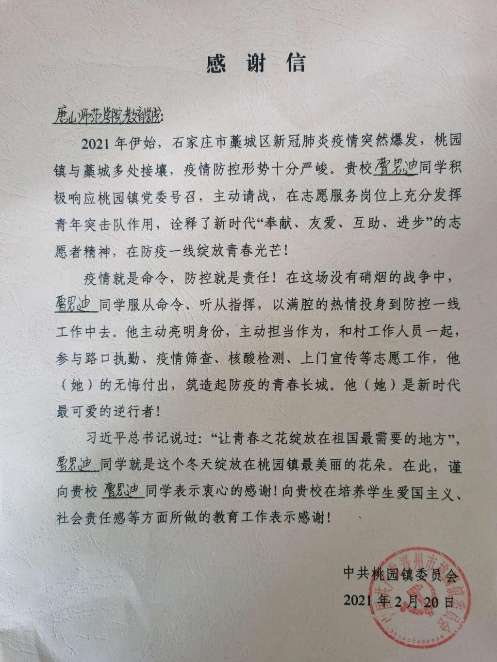 我院2019级学前教育专科4班学生曹思迪,主动担当作为,和村工作人员一起,参与路口执勤、疫情检查,筑起防疫的青春长城,得到中国共产党晋州市桃园镇委员会的感谢和表扬!