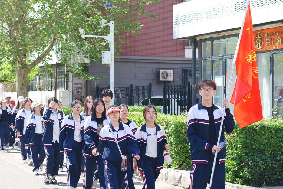 行进途中,学子们高唱团歌,互相扶持。16华里的路程不仅是体力的考验,更是一场精神的洗礼。2023级发展团员张欣烨感慨:“每一步都让我想到革命先辈的艰难跋涉。疲惫时,是队友的鼓励和胸前的团徽化作动力,让我咬牙坚持。”抵达终点后,全体团员肃立于李大钊雕像前,紧握右拳庄严宣誓,铿锵誓言与松涛声交织,团旗在风中猎猎飘扬,让历史与现实在这一刻紧密相连。