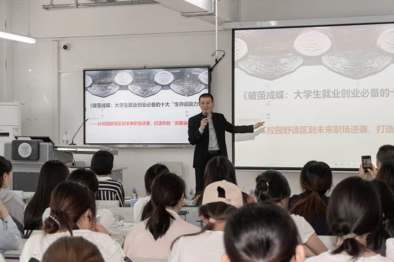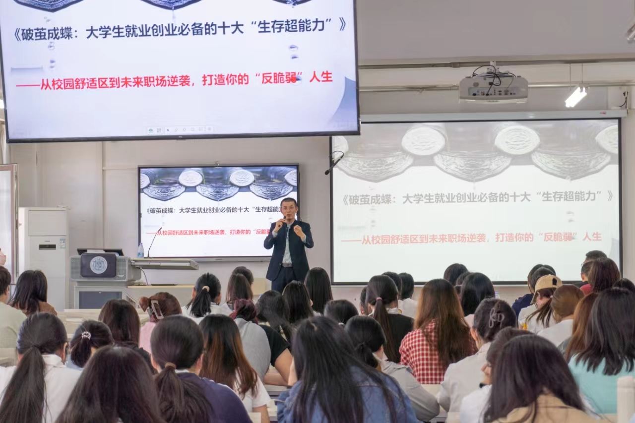 2025年5月14日,yL23411永利集团邀请慧根生国学商道智慧研修院副院长时海棋老师以《破茧成蝶:大学生就业创业必备的十大“生存超能力”》为主题,面向大学生进行创业讲座,通过解码《大学》等典籍的当代价值,为百余名学子讲解从校园舒适区到未来职场逆袭的底层逻辑,打造“反脆弱”人生。